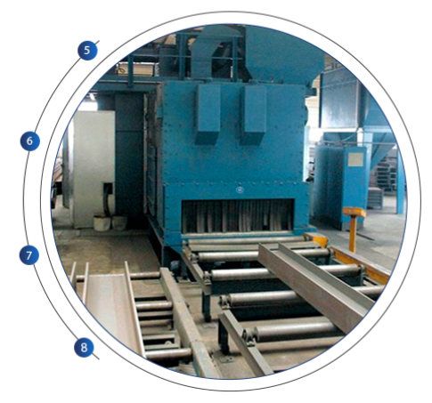Equipment: rollers conveyor, blasting chamber, blast wheel, abrasive recycle system, separator , cleaning chamber, dust collector, PLC control system etc.