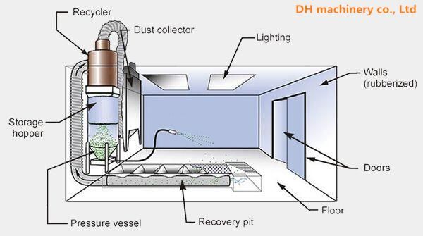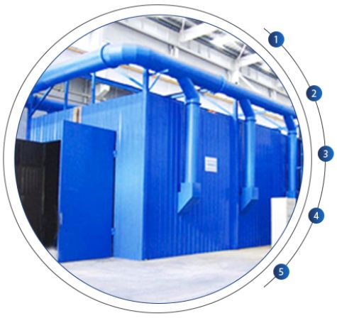 ●We provide a minimum level of dust in the chamber, since dust that is formed during the shotblasting procedure is removed using a cartridge dust collector, whereas fresh air enters the chamber through the ceiling