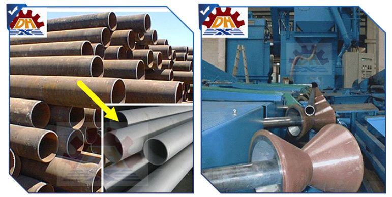 Application: The machine is specifically designed for the continuous external surface treatment of pipes and cylindrical parts (bottles reservoirs, etc. ).